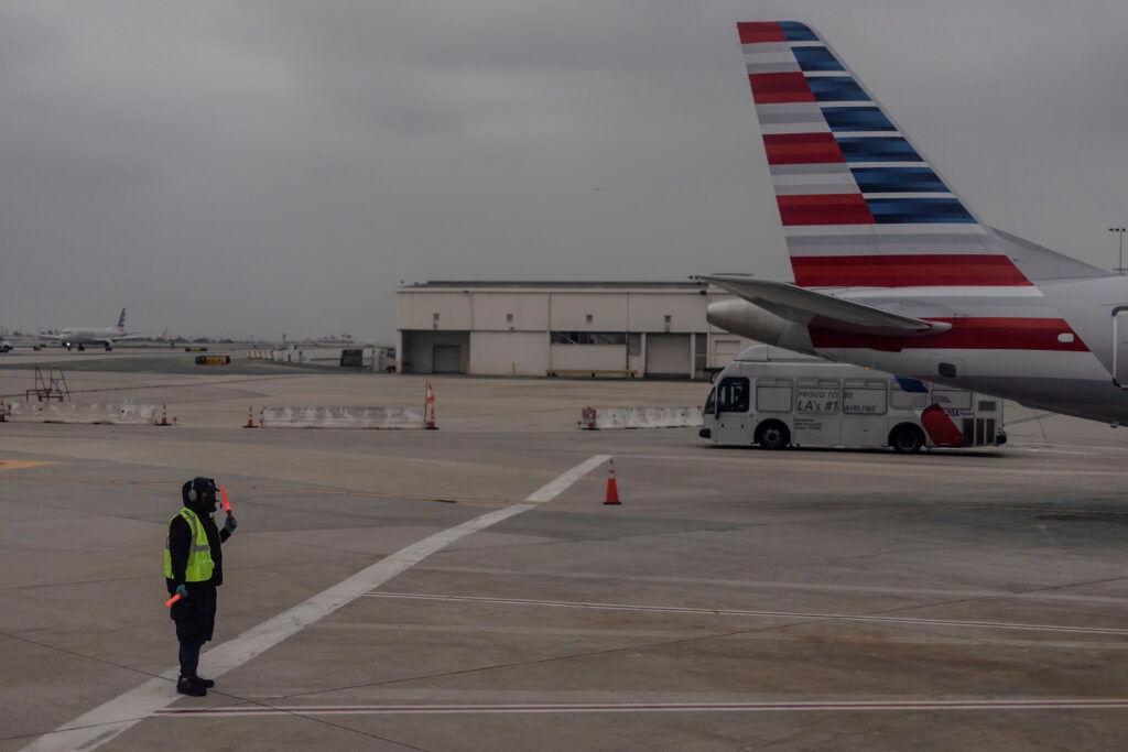 An American Airlines worker is seen at the Los Angeles international airport in Los Angeles, California, U.S., October 31, 2021. REUTERS/Carlos Barria/File Photo