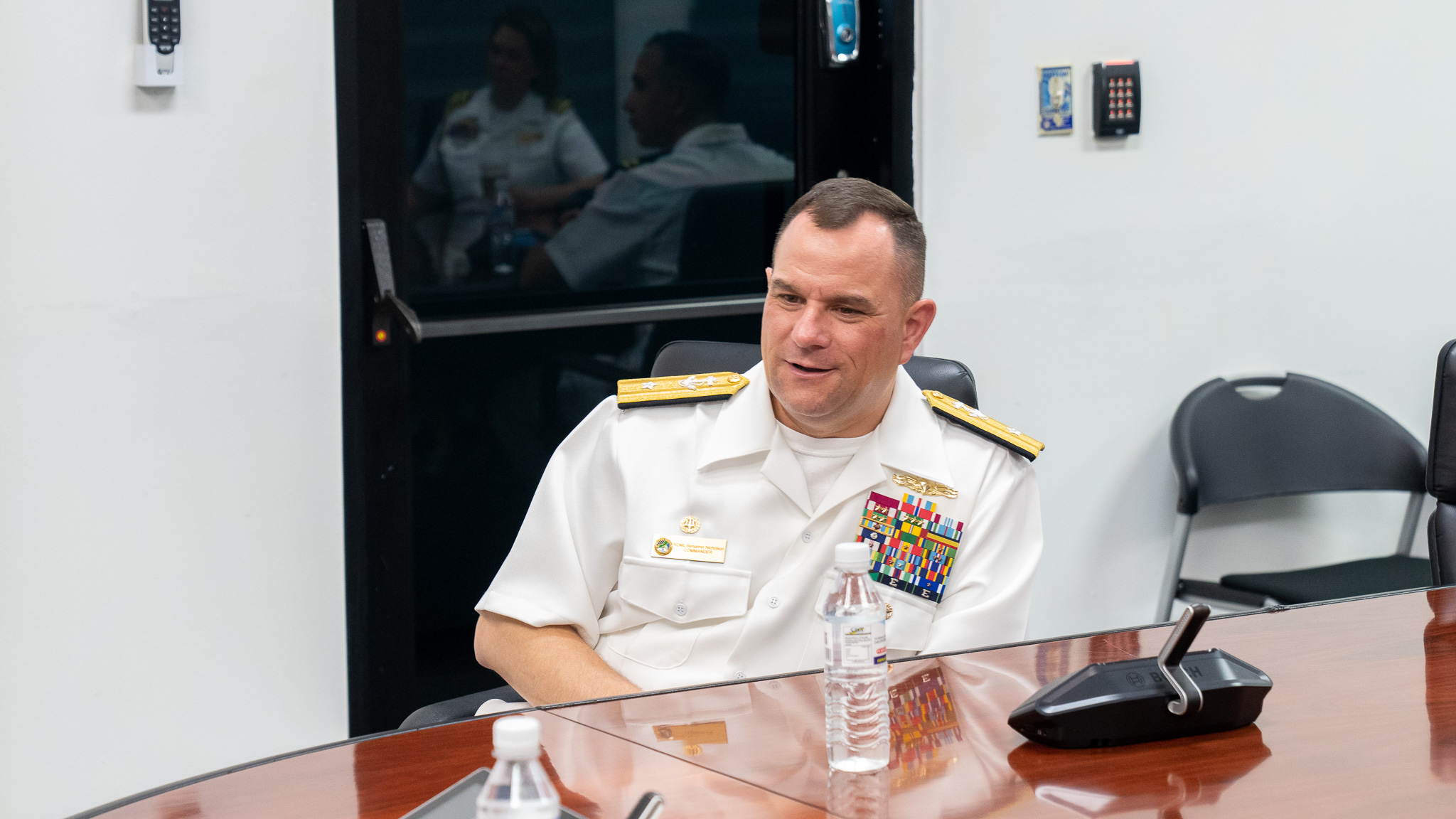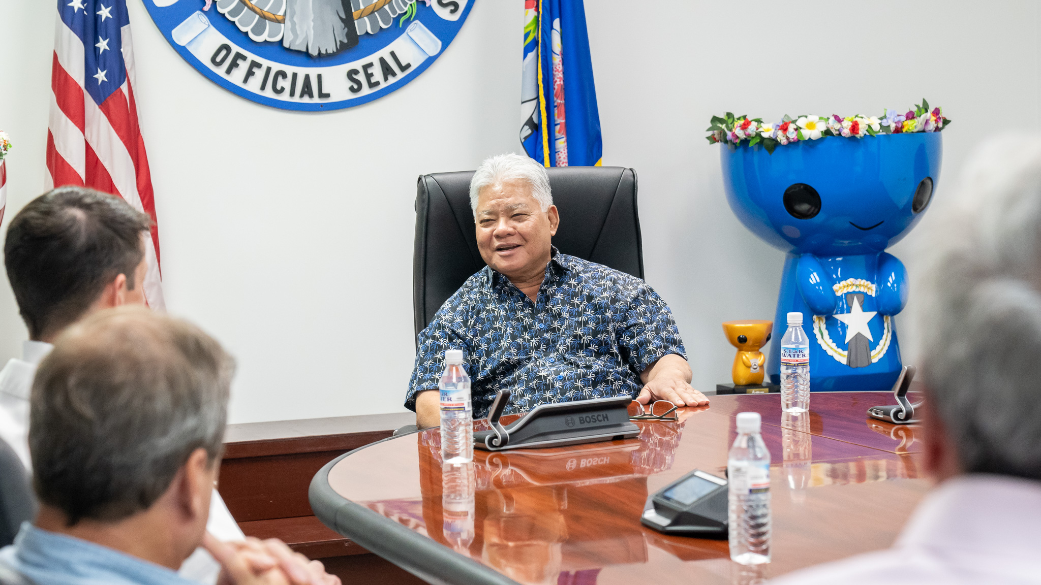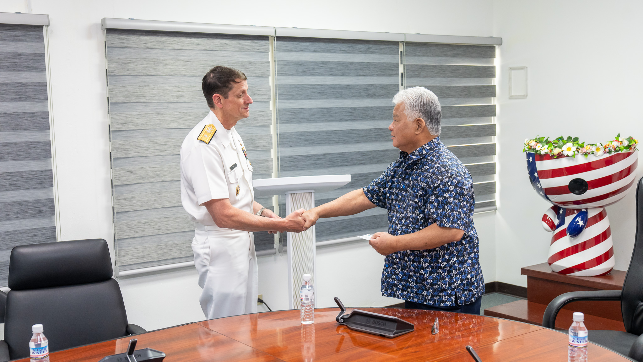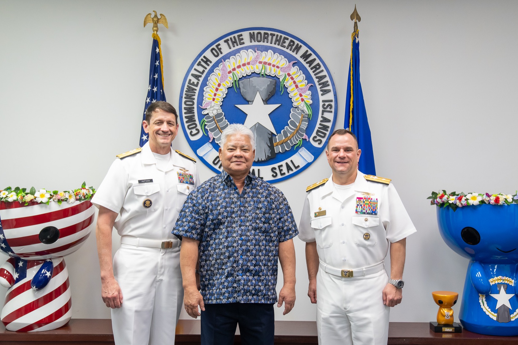 Outgoing Joint Region Marianas Commander Rear Adm. Benjamin R. Nicholson, right, on Friday facilitated the formal introduction between Gov. Arnold I. Palacios, center, and incoming JRM Commander Rear Adm. Gregory C. Huffman. Governor Palacios expressed his appreciation for the expanded partnership and increased communication between the CNMI and JRM and wished outgoing JRM Commander Nicholson the best in his future endeavors. Governor Palacios also congratulated Rear Admiral Huffman on his new position as incoming JRM commander and reiterated the valuable partnership that JRM has provided to the Commonwealth, especially during the aftermath of Typhoon Mawar in Rota. Both stressed the need for continued collaboration between the CNMI and JRM.