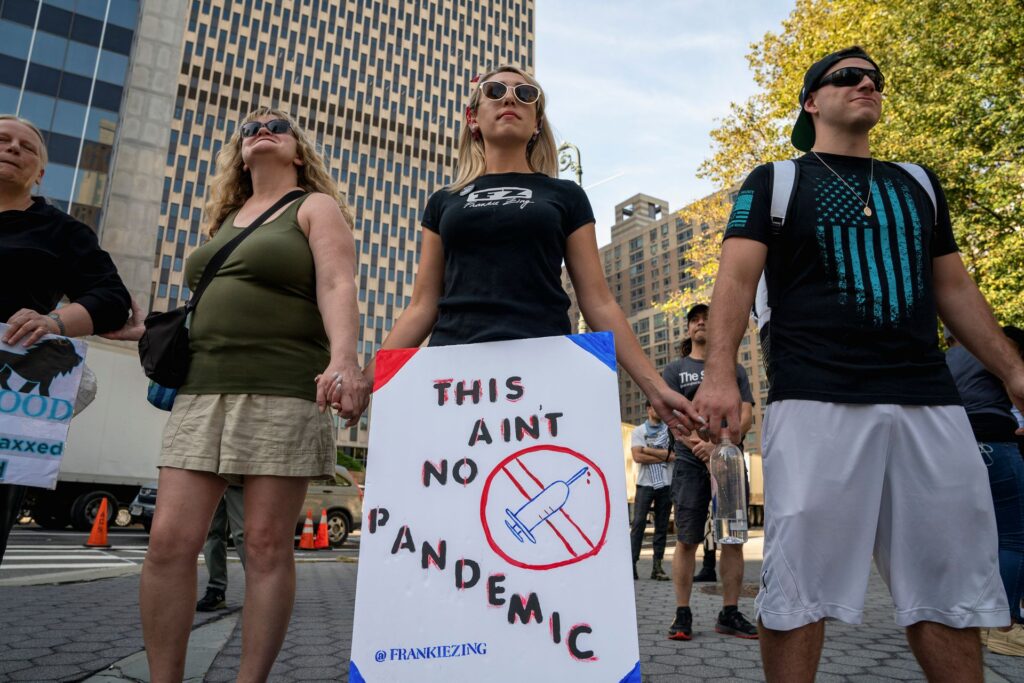 People gather during a protest against mandated coronavirus disease vaccines and vaccine passports in New York City on Sept. 27, 2021.