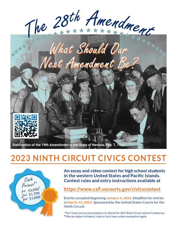 SAN FRANCISCO — “The 28th Amendment to the United States Constitution: What Should Our Next Amendment Be?” is the theme of the 2023 Ninth Circuit Civics Contest, which is an annual essay and video competition open to high school students in states and territories within the jurisdiction of the Ninth Circuit.