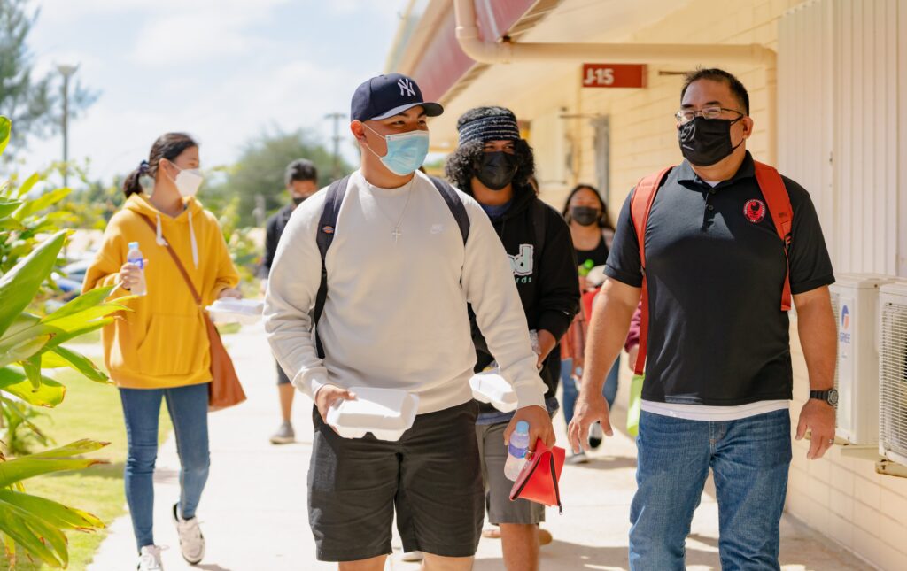 Northern Marianas College Criminal Justice Department Chair Clement Bermudes, right, talks with a student on the first day of the Spring 2022 semester. NMC started its spring semester on January 18, 2022.
