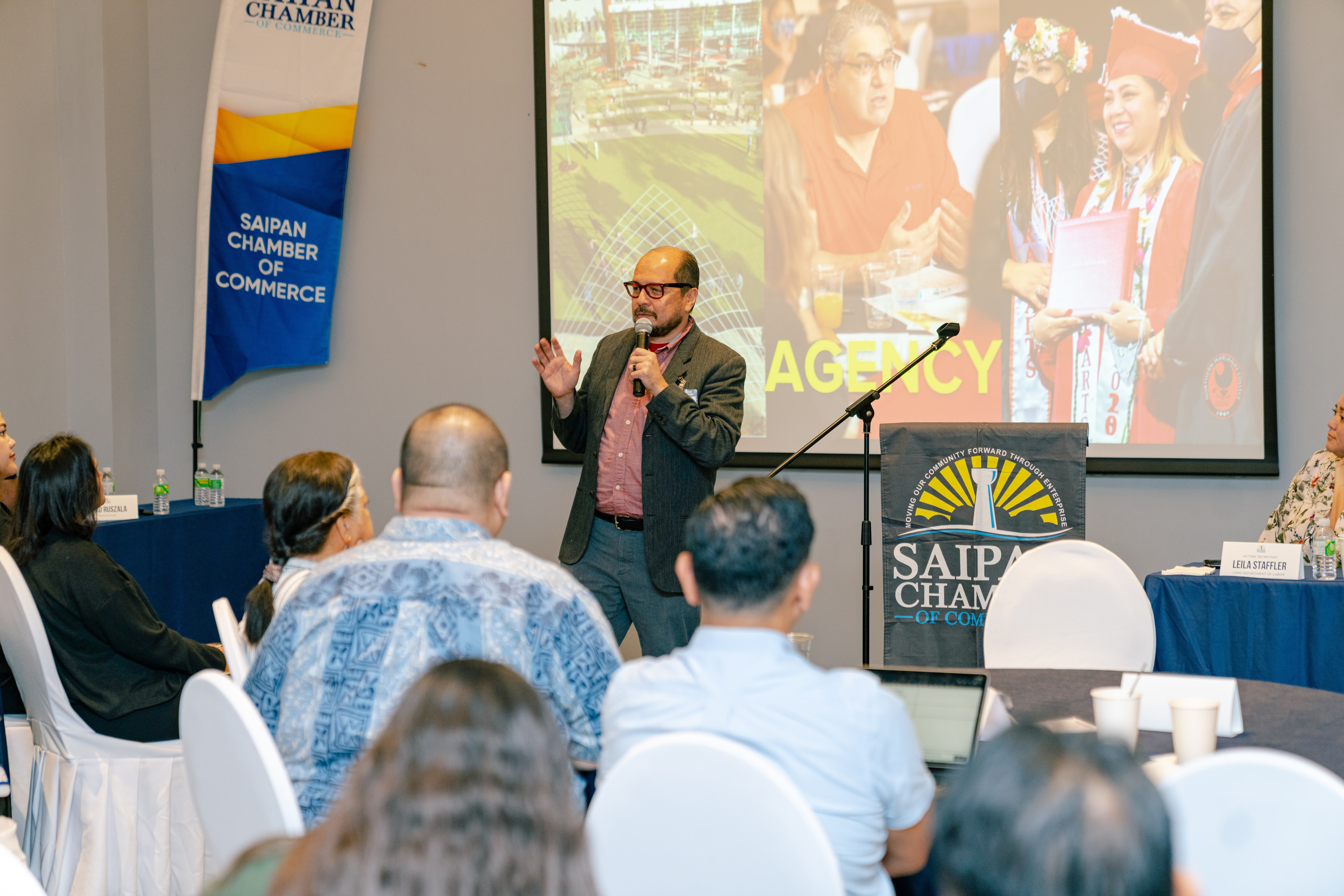 Northern Marianas College President Galvin Deleon Guerrero, EdD, gave the keynote address for the Saipan Chamber of Commerce Economic Forum on Wednesday and advocated for building intellectual capital in the CNMI. These include accelerated cohort-based programs with experiential-based credits and interdisciplinary courses; increasing academic research capacity; and investing in the reskilling and upskilling the workforce through NMC’s Community Development Institute. Deleon Guerrero also emphasized the college’s commitment to cultivating entrepreneurship and business growth through the CNMI Small Business Development Center while harnessing agricultural and aquacultural programs at NMC’s Cooperative Research, Extension and Education Services to diversify food industries and increase food security in the Commonwealth.