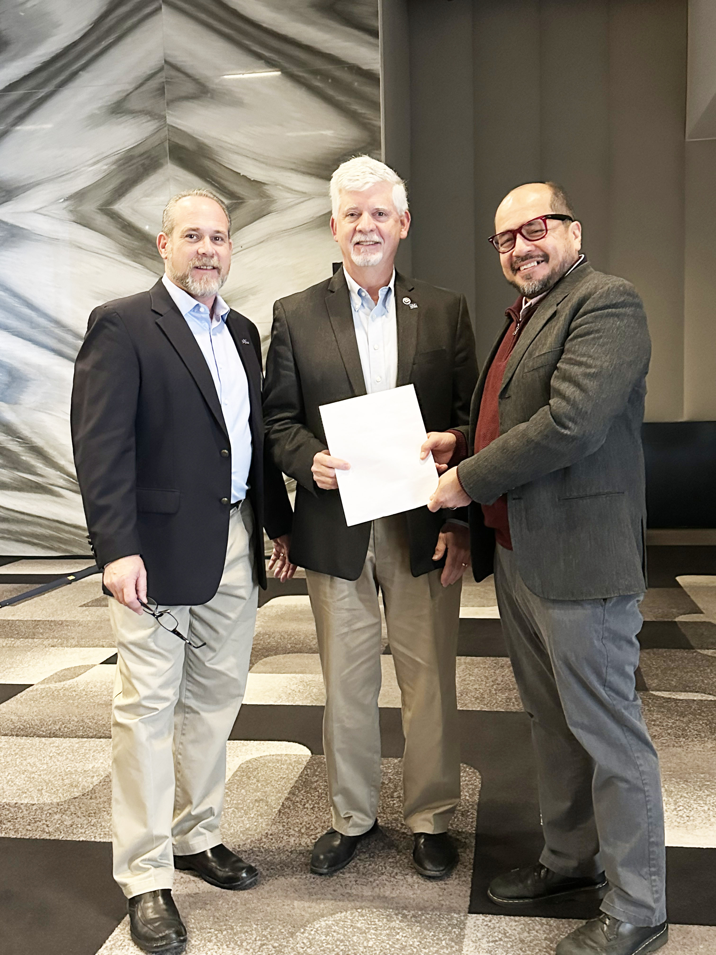 At the 2023 Spring Sea Grant Association meeting in Washington D.C., Northern Marianas College President Galvin Deleon Guerrero, Ed.D., right, helped move NMC’s bid to become a Sea Grant institution closer to fruition by networking with other Sea Grant institutions, developing partnerships for research and environmental stewardship, and officially submitting the college’s formal letter of intent to become a Sea Grant institution to Dr. Jonathan Pennock, center, director for the National Sea Grant Office, and Dr. Darren Learner, left, Sea Grant Association president.