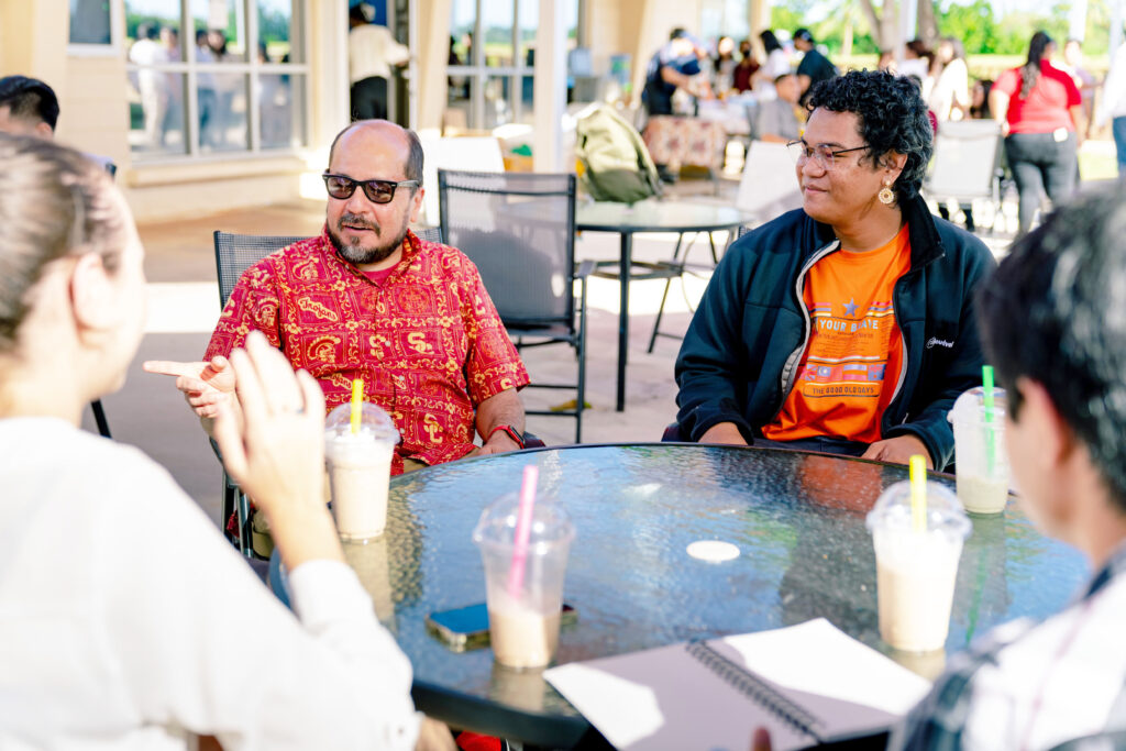 Northern Marianas College President Galvin Deleon Guerrero, EdD, talks with NMC students on Wednesday during Welcome Week at the college.