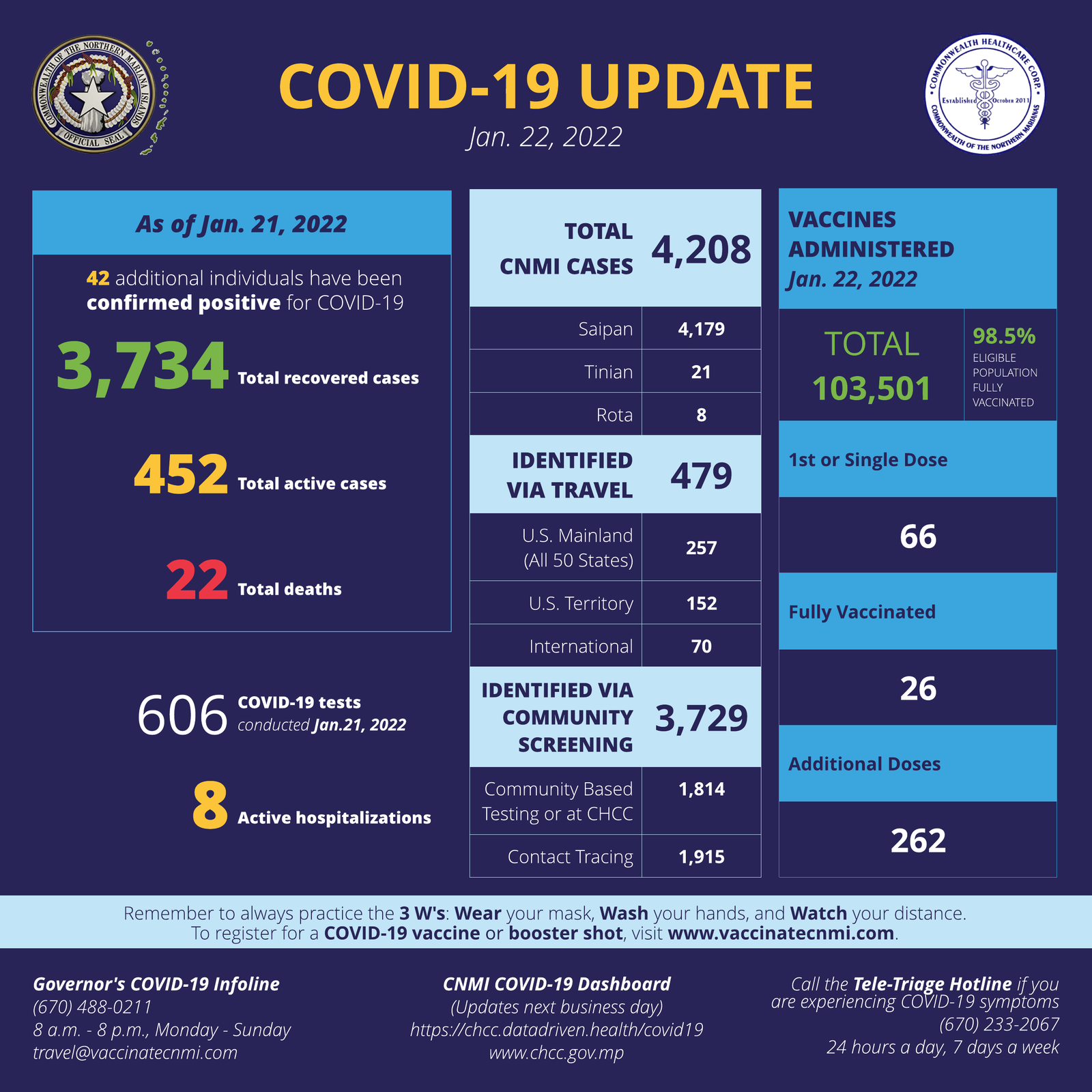 A total of 354 Covid-19 vaccines were administered on Jan. 22, 2022, resulting in 98.5% of the CNMI’s eligible population being fully vaccinated.