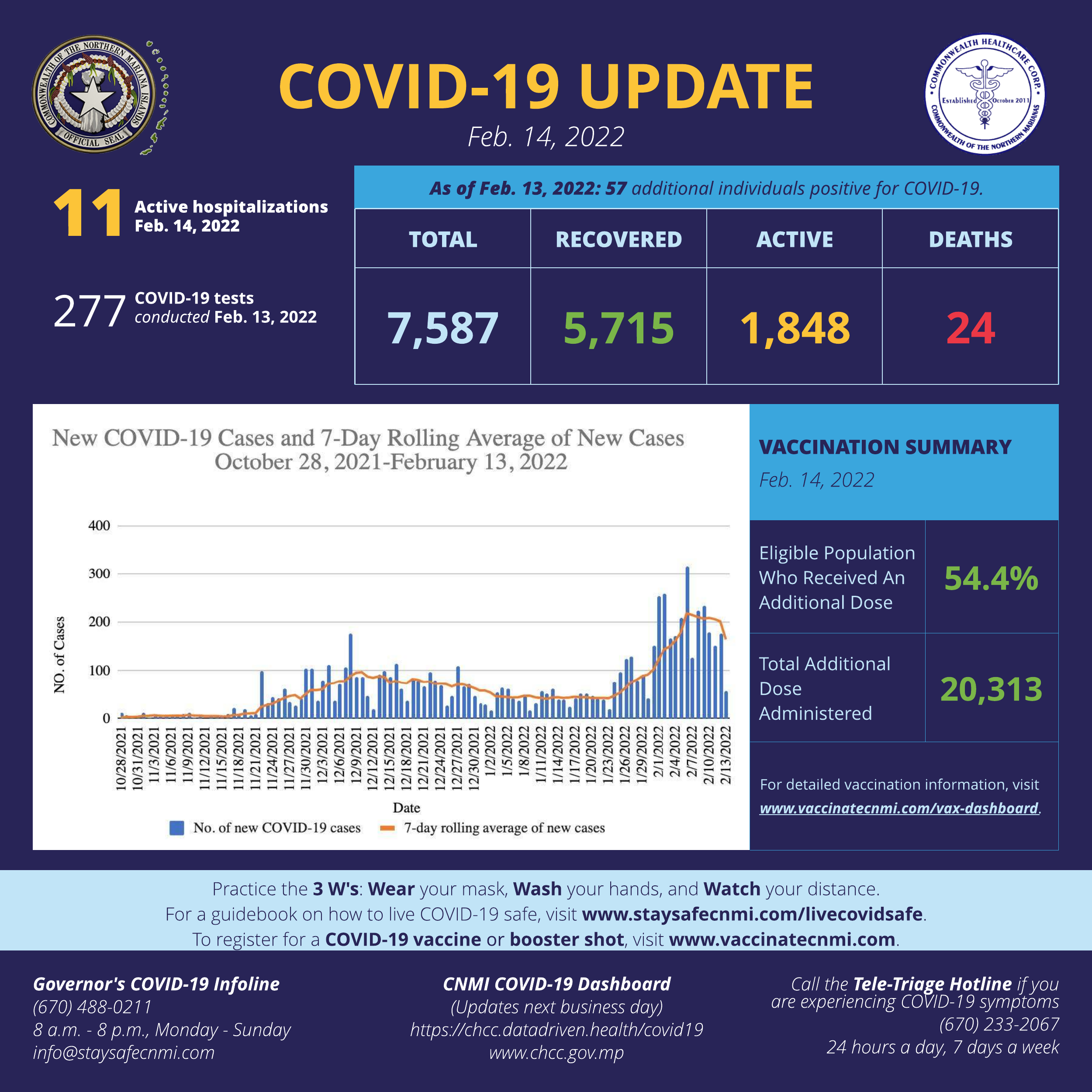 57 additional individuals have been confirmed positive for Covid-19, bringing the CNMI total to 7,587 cases since March 26, 2020. The individuals have been isolated and are actively monitored.