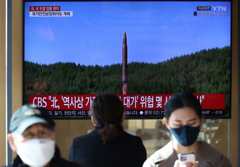 People watch a TV broadcasting a news report on North Korea firing a ballistic missile off its east coast, in Seoul, South Korea, November 2, 2022.