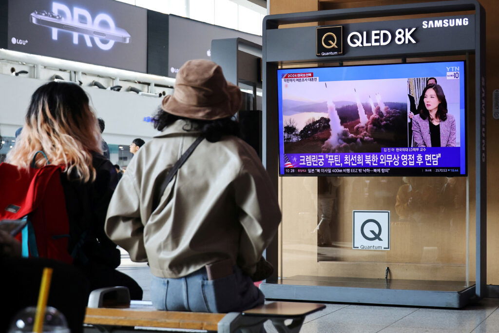 People watch a TV broadcasting a news report on North Korea firing missiles that flew 400 km after lifting off at around 7:30 a.m. from Sariwon, just south of the capital Pyongyang, at a railway station in Seoul, South Korea, Nov. 5, 2024.