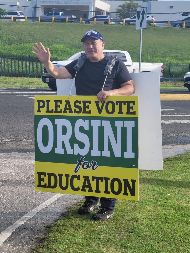 Board of Education member Andrew Orsini, who is seeking re-election, waves at motorists at the intersection of Middle Road and Micro Beach St. on Navy Hill Thursday last week.