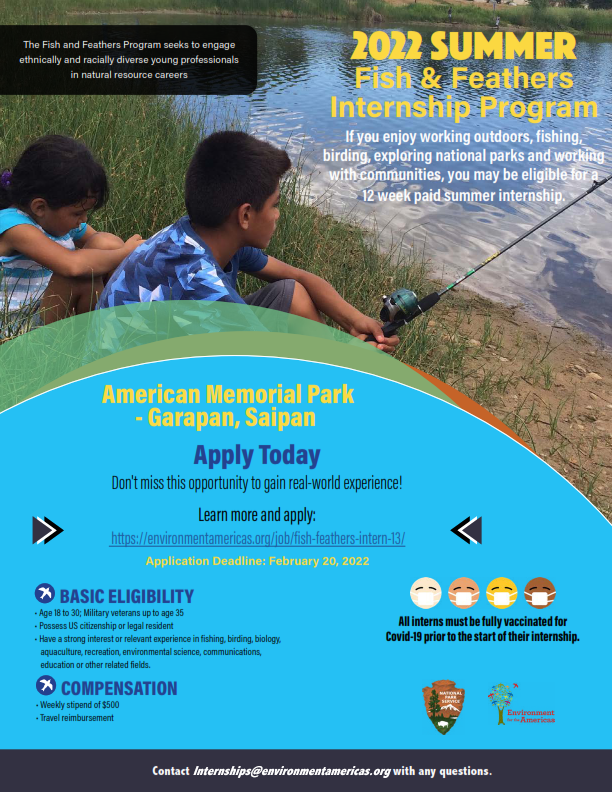 IF you enjoy being outdoors, fishing, exploring your national park and working with our island community you may be eligible for a 12 week internship at American Memorial Park through a partnership with Environment for the Americas. Over the summer, the Fish and Feathers intern will work with park rangers and partners to help promote safe and sustainable fishing along the park’s shores.