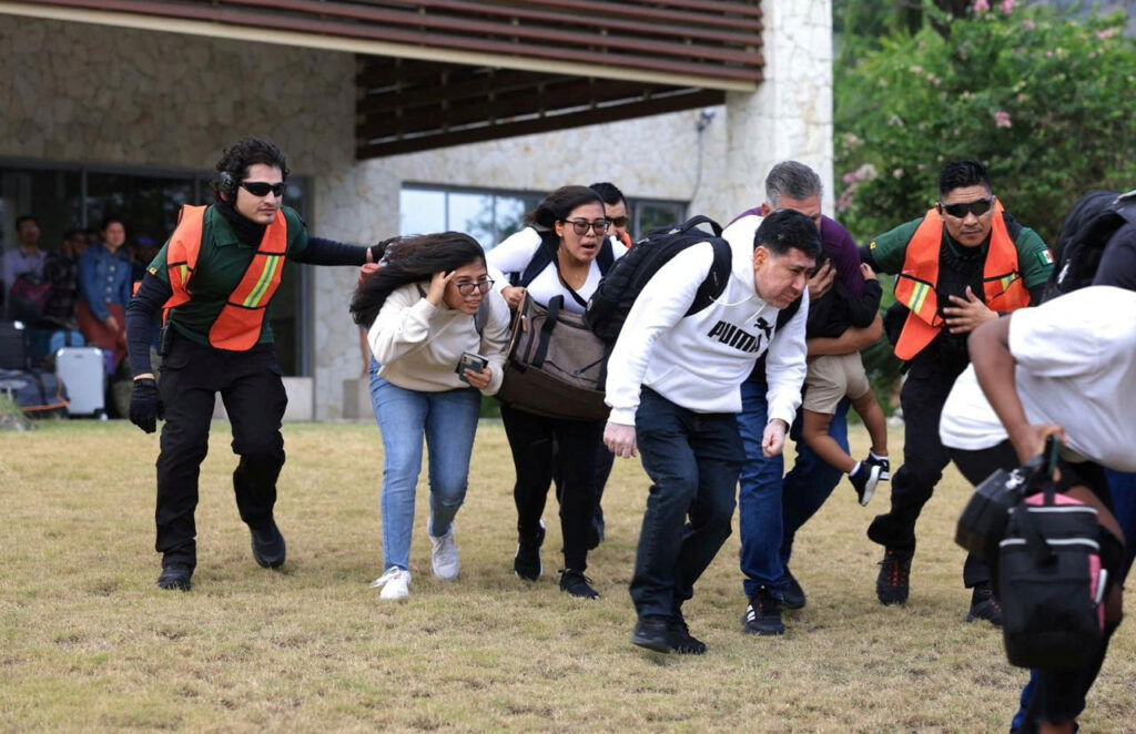 Mexican citizens walk toward an helicopter as they are evacuated from Haiti by personnel of the Mexican Navy, in Port-au-Prince, Haiti, in this handout picture released on April 1, 2024.