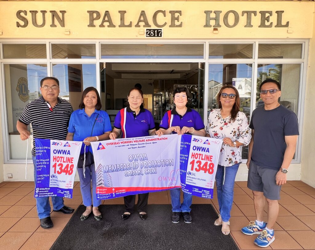 A six-day outreach by the Philippine Overseas Workers Welfare Administration will be held starting today, Monday, at the Sun Palace Hotel on Saipan to serve the needs of the Filipino workers in the CNMI. Assisted by the Philippine Consulate General-Guam core volunteers for the CNMI, the three-person OWWA team is composed of Prescilla Pamela Flores, chief, Membership Processing Center; Mercedes M. ILano, OWWO IV, Overseas Operations Coordination Service; and Zara Zits P. Reyes, administrative assistant III, Fund and Investment Management Office. They arrived on island Sunday and were welcomed by PCG core volunteers Annamae Adaza, Mario Mayuga, Ariel Mariano and Ulysses Torres-Sabuco.