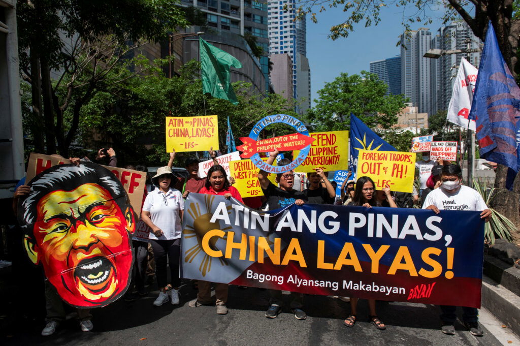 Filipino activists hold a protest condemning China’s actions during an encounter in the disputed waters of the South China Sea, outside of the Chinese Consulate in Makati City, Metro Manila, Philippines, April 9, 2024.