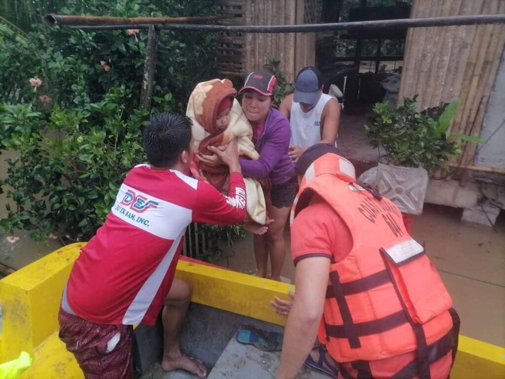 A rescuer assists a woman and her child onto a rescue boat, after tropical storm Megi hit Capiz province in the central Philippines, April 12, 2022.