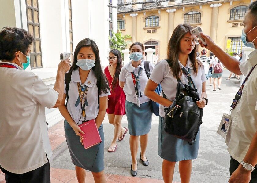 Students are checked by body thermal scanners as a precautionary measure against the spread of a new virus at a school in Manila, the Philippines, Friday. AP