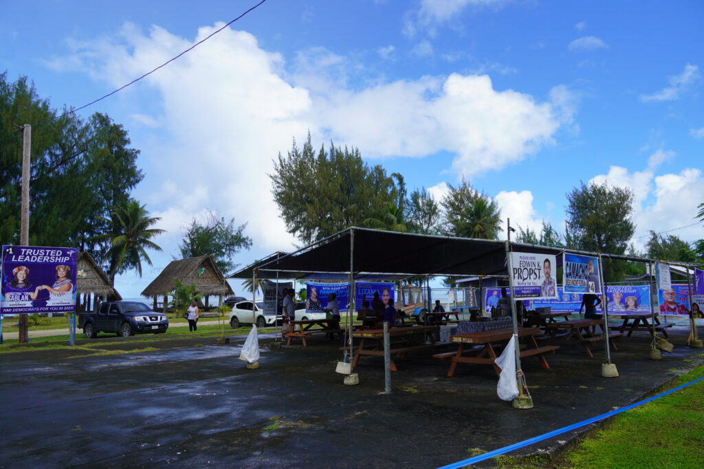Supporters, candidates and party leaders gather early Tuesday morning under the NMI Democratic Party canopies across from the multi-purpose center.