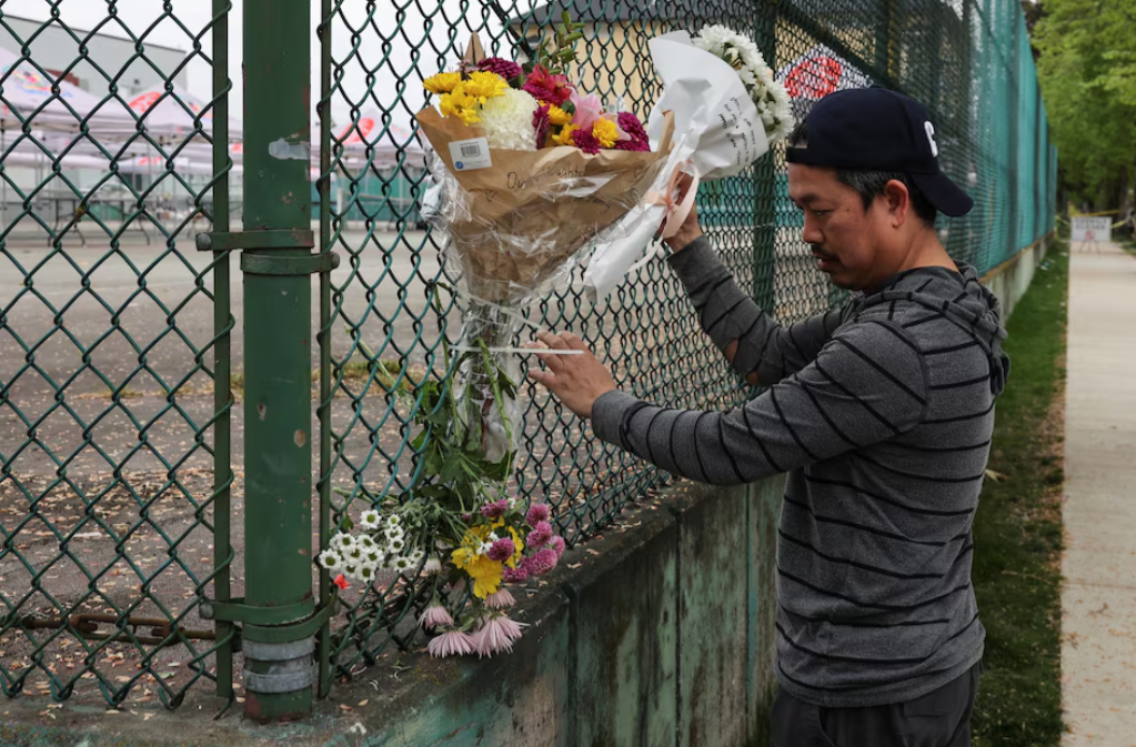A man places tributes on a fence after a vehicle was driven into a crowd at a Lapu Lapu day block party in Vancouver, Canada.REUTERS