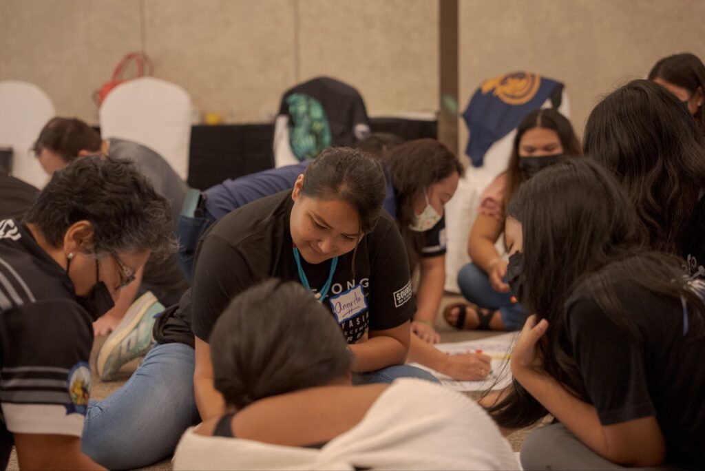 Annrita Benavente, behavioral health specialist, and the SOS Training Team work alongside Hopwood Middle School peer leaders and adult advisors Femie Rey and Ma. Jyn Binghit as they visualize their sources of strength for an illustration activity.