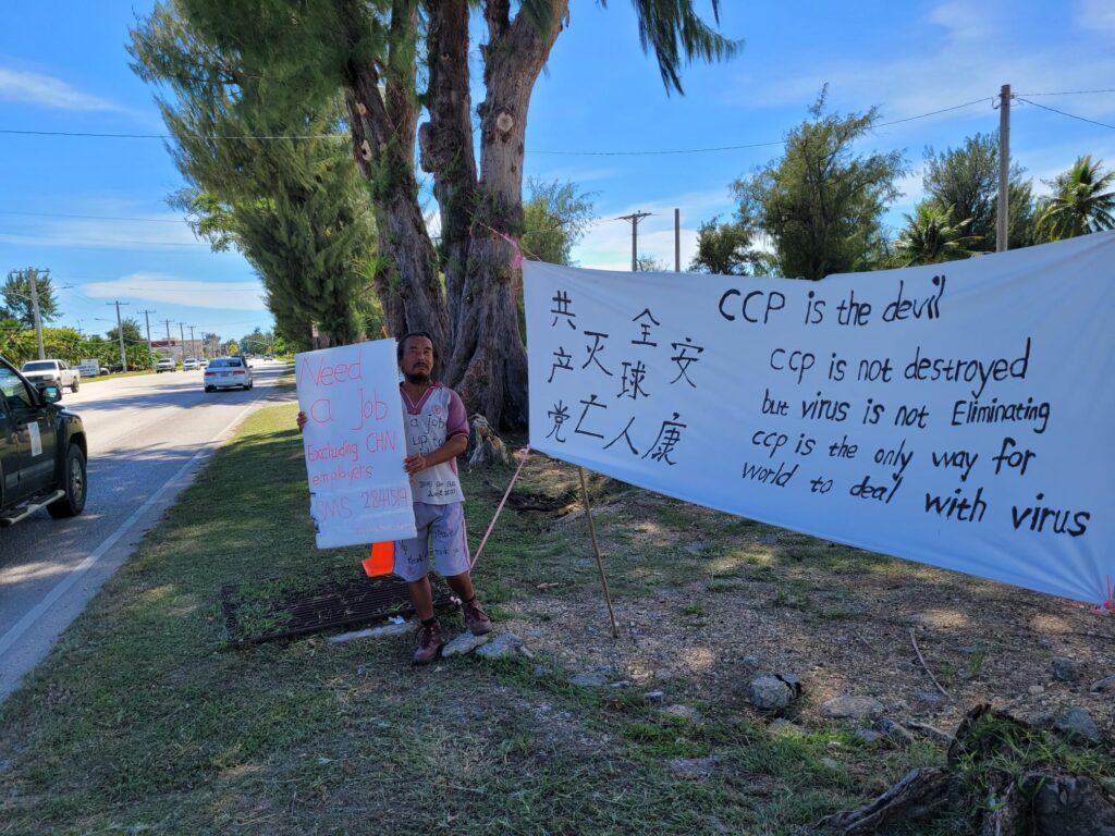 Shanguo Zhang holds a sign during a protest action on Beach Road across from the judicial building in Susupe.
