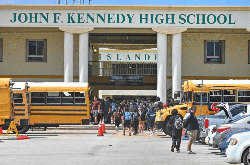 Simon Sanchez High School students rush to enter the campus on Monday, Nov. 13, 2023, at John F. Kennedy High School in Tamuning.