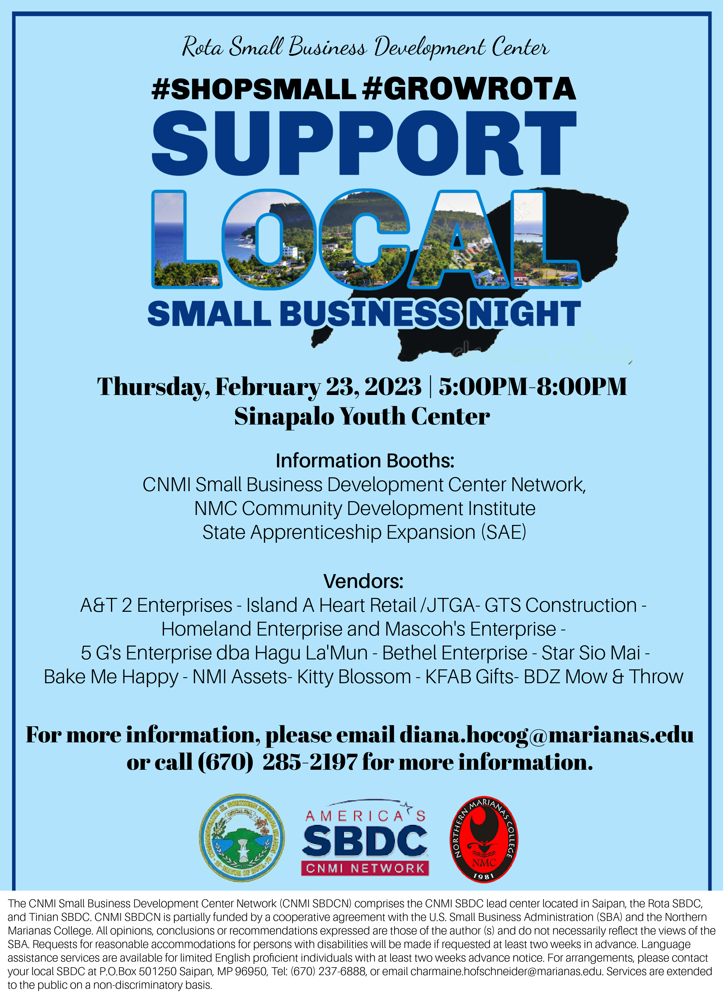 (NMC) — The Rota Small Business Development Center at Northern Marianas College will be hosting its first Business Night, featuring both seasoned and upcoming local entrepreneurs and their products and services. The community is invited to attend the event, which is supported by the Rota Mayor’s Office.