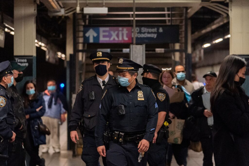 Police officers patrol in Times Square station, after a shooting at a subway station in Brooklyn borough, in Manhattan, New York City on April 12, 2022.