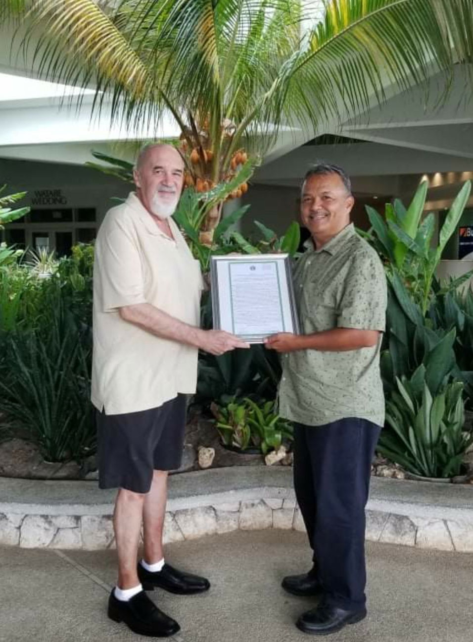 Sen. Paul A. Manglona, right, hands a framed copy of Senate Resolution 21-4 to James William Toskas, MD, DABFM.