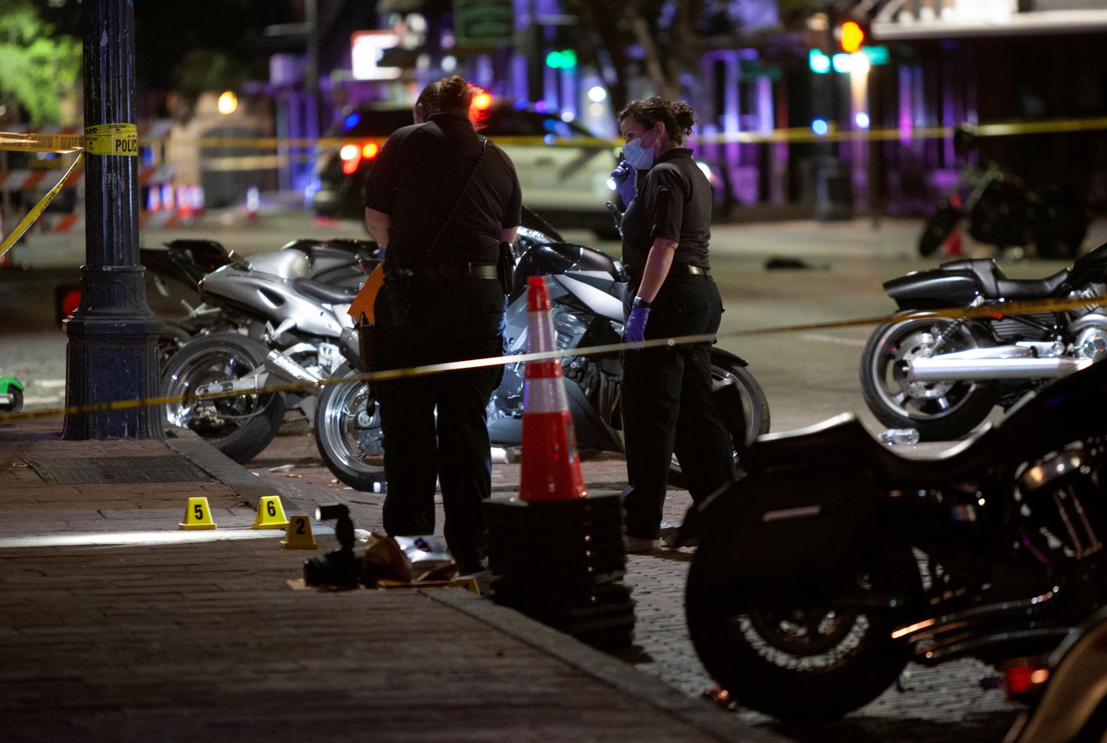 Police investigate the scene of a mass shooting in the Sixth Street entertainment district area of Austin, Texas on June 12, 2021.