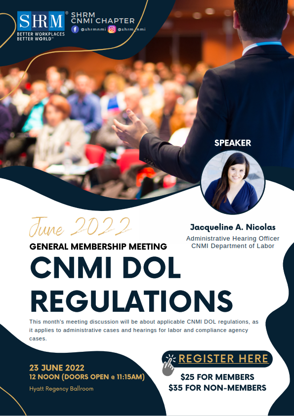 (Press Release) — The Society for Human Resource Management-CNMI Chapter will host a general membership meeting in the Regency Ballroom of Hyatt Regency Saipan on Thursday, June 23, 2022, starting at 12 noon. Doors will open at 11:15 a.m.