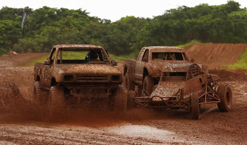 Three vehicles converge in the 40th APL Smokin’ Wheels Off-road Enduro race Sunday, April 23, 2023, at the former Guam International Raceway in Yigo.