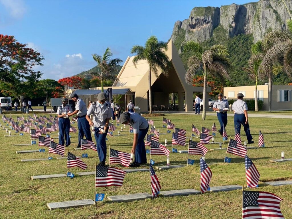 Cadets placed individual U.S. and CNMI flags, flower bouquets, and candles onto the gravestones of the fallen heroes. They also distributed copies of the event program and bottled water to those who gathered at the cemetery.