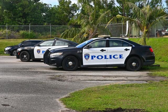 Police vehicles are parked next to the Dededo Precinct on Tuesday, Jan. 2, 2024.