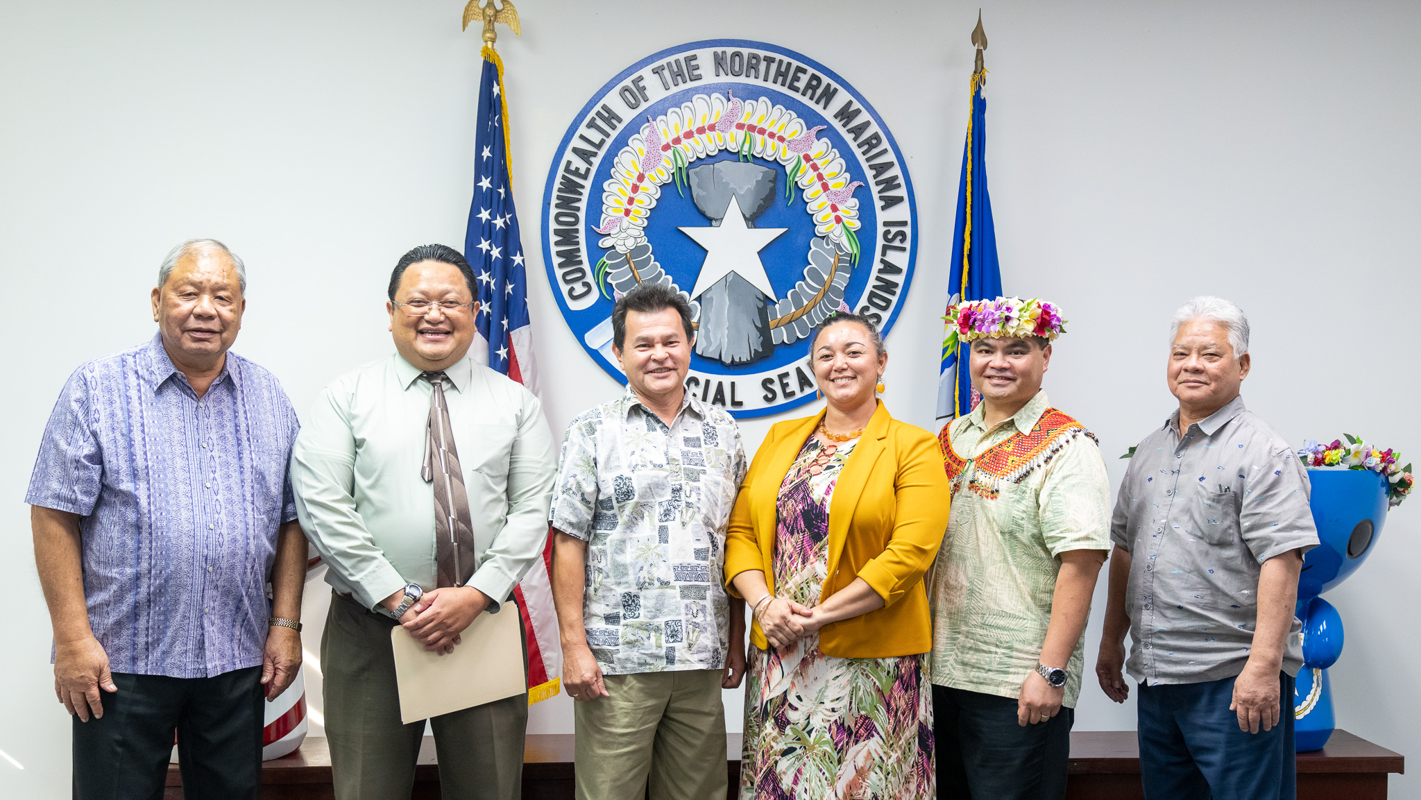 On Wednesday afternoon, Gov. Arnold I. Palacios, right, and Lt. Gov. David M. Apatang, left, administered the oath of office to Secretary of Labor Leila F. Staffler, 3rd right, Secretary of Lands and Natural Resources Sylvian O. Igisomar, 2nd right, and Commonwealth Zoning Board Members Henry S. Hofschneider, 3rd left, and Michael N. Evangelista, 2nd left. The governor and lt. governor extend their congratulations and best wishes to Secretary Staffler, Secretary Igisomar, Board Members Hofschneider and Evangelista on their appointments.