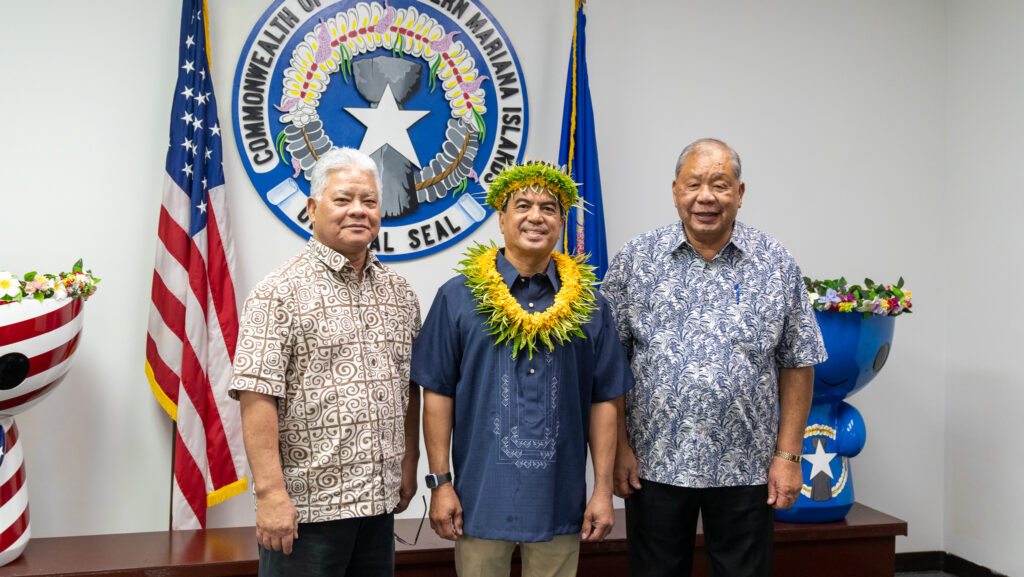 Gov. Arnold I. Palacios, left, and Lt. Gov. David M. Apatang, right, pose for a photo with newly sworn in Secretary of Public Works Ray N. Yumul on Thursday at the governor’s office. The governor and lt. governor extend their congratulations to Secretary Yumul on his appointment to the Department of Public Works.