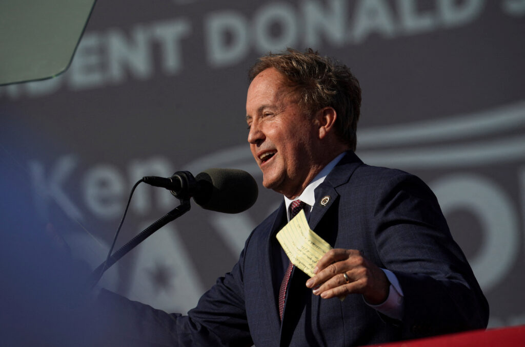 FILE PHOTO: Texas Attorney General Ken Paxton speaks ahead of a rally held by former U.S. President Donald Trump, in Robstown, Texas, U.S., October 22, 2022. REUTERS/Go Nakamura/File Photo