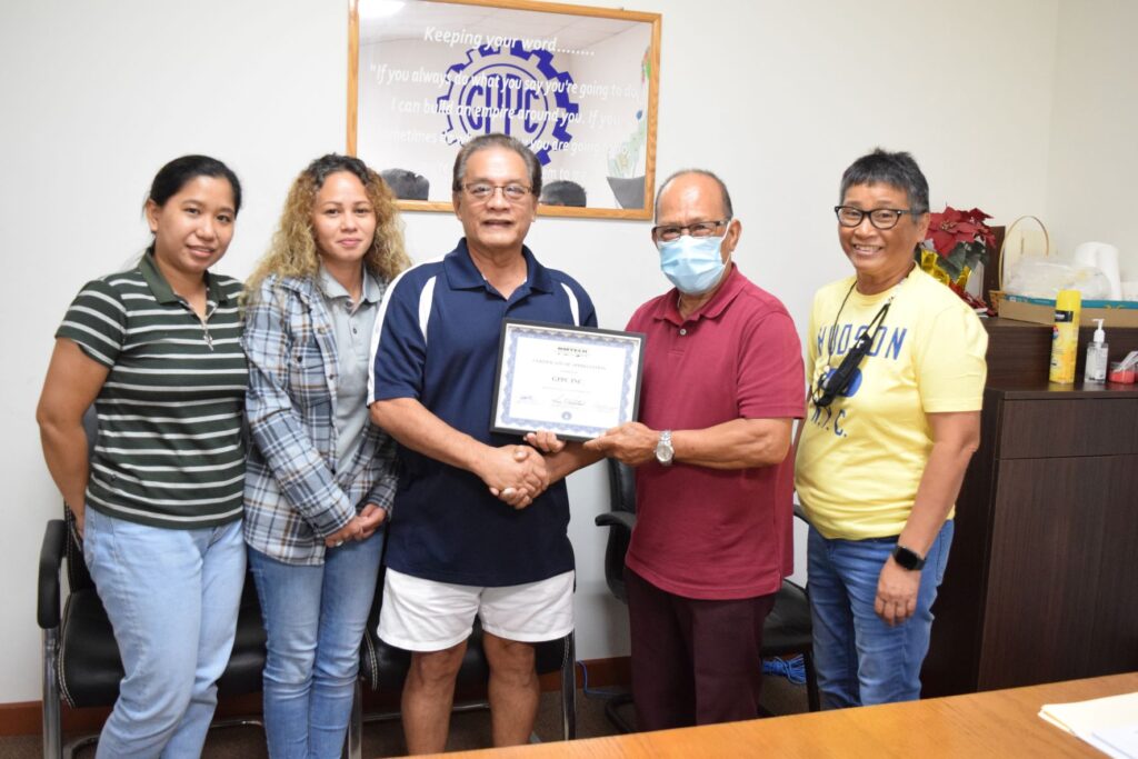 Northern Marianas Technical Institute Public Relations Officer Vic Cepeda, second right, hands a framed copy of certificate of appreciation to GPPC consultant John “Liling” Reyes, center, as they pose for a photo with  GPPC vice president/contracts manager Annie Pagulayan, right, GPPC project management specialist Lanie Deleon Guerrero and administration/accounting manager Elaine Magcalas at the GPPC office in As Perdido on Thursday. GPPC has been making education tax credit donations to NMTI since the trade school was established by the late businessman Tony Pellegrino. GPPC, for its part, says it appreciates NMTI’s role in creating a skilled local workforce.