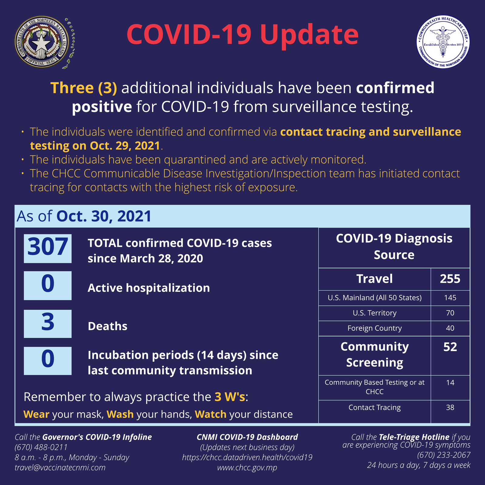 (Commonwealth Healthcare Corp.) — Three additional individuals have been confirmed positive for Covid-19, bringing the total count for the CNMI to 307 individuals since March 28, 2020.