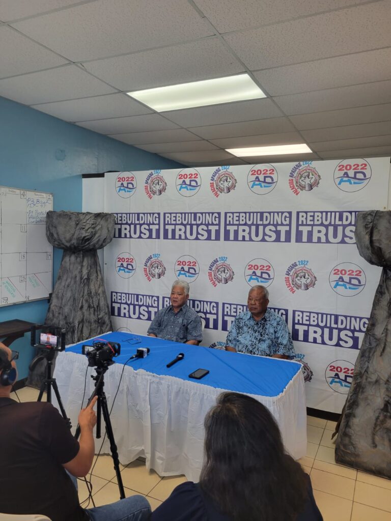 Independent gubernatorial candidate Lt. Gov. Arnold I. Palacios and his running mate, Saipan Mayor David M. Apatang, talk to media members during a press conference at the AD 2022 headquarters on Thursday.