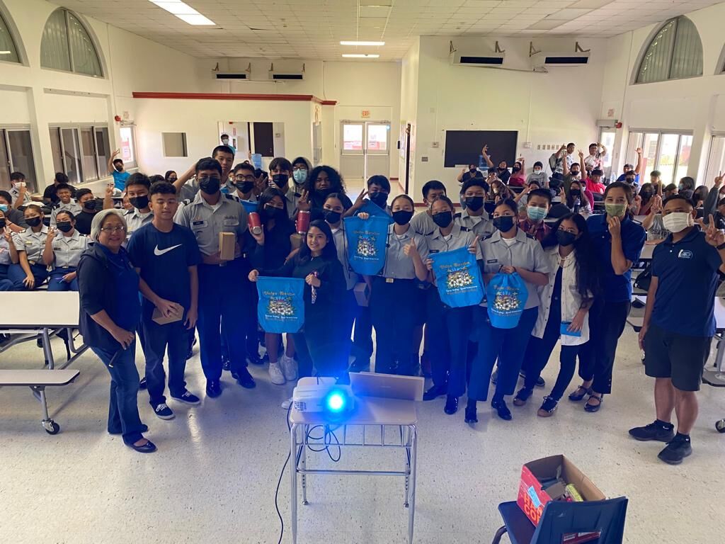 Tenth graders of Tinian Jr./Sr. High in San Jose, Tinian, learn about tourism and the Marianas Visitors Authority on Oct. 13, 2021.  Pictured are Marianas Touris Education Council acting Chairwoman Vicky Benavente, left, students and other MTEC and MVA representatives.