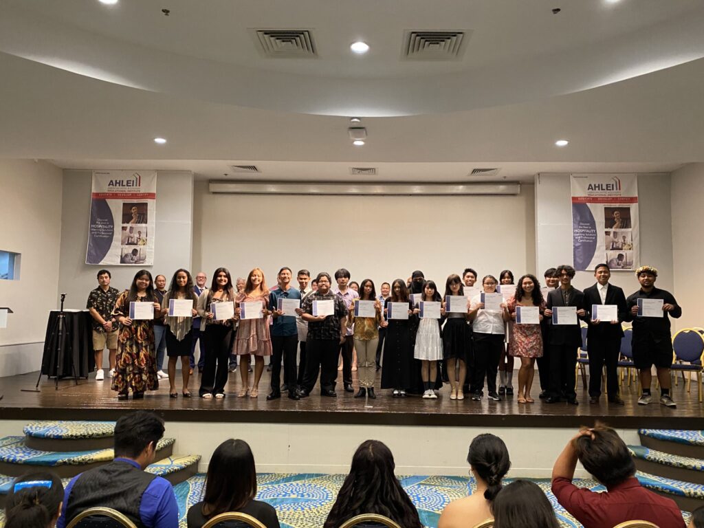 At the ceremony, Jim Arenovski, owner of Island Training Solutions and regional training partner for AHLEI, called the Trading Up: Hospitality program part of a “pipeline” to a career in the hospitality agency. He mentioned that as early as middle school, students can take part in programs under the Marianas Tourism Education Council, move on to dual enrollment with Trading Up: Hospitality, and move on to earn an associate of arts in hospitality at Northern Marianas College.