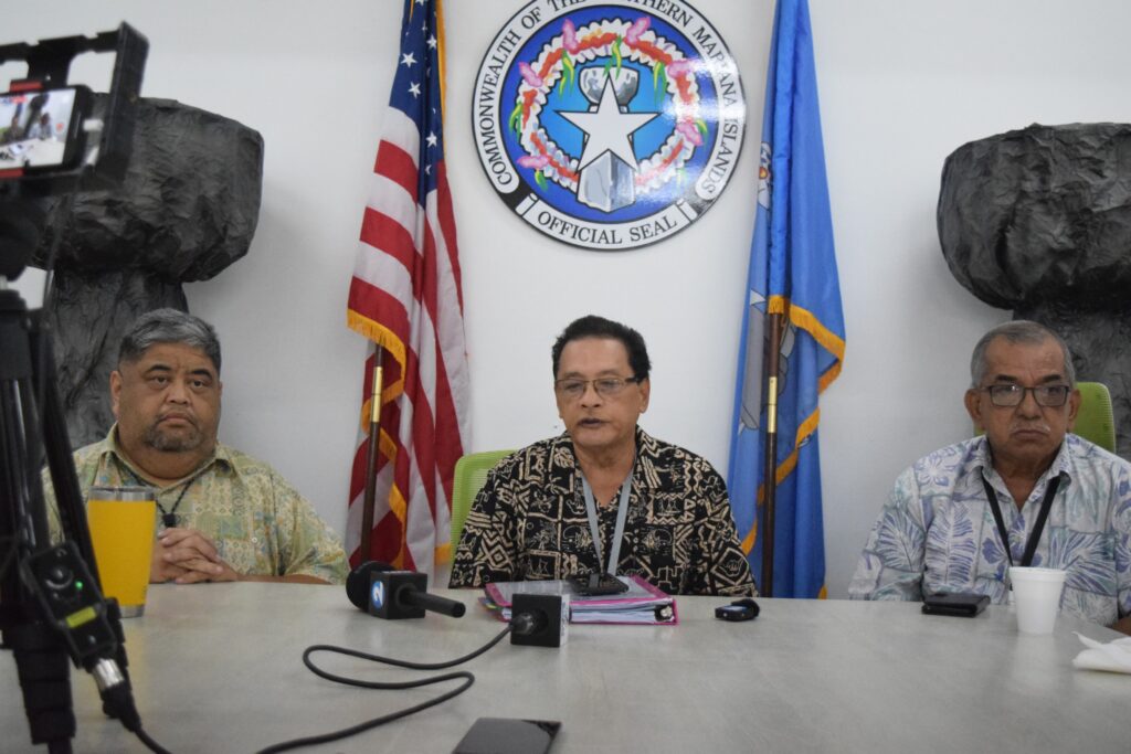 Overall transition committee chairman, former Rep. John “Liling” Reyes, center, talks to  members of the media, as transition subcommittee vice chairman former Rep. Claudio Norita, left, and inauguration subcommittee vice chairman, former Speaker Oscar M. Babauta, listen during a media conference at the transition committee office in Susupe on Monday.