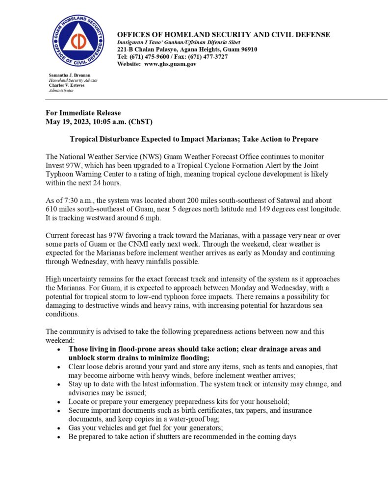 Based on the current forecast, the disturbance identified as 97W is likely to track towards the Marianas, potentially passing very near or over certain parts of Guam or the CNMI early next week. The weather conditions in the Marianas are expected to remain clear throughout the weekend, but inclement weather, including heavy rainfall, is anticipated to commence as early as Monday and persist until Wednesday.