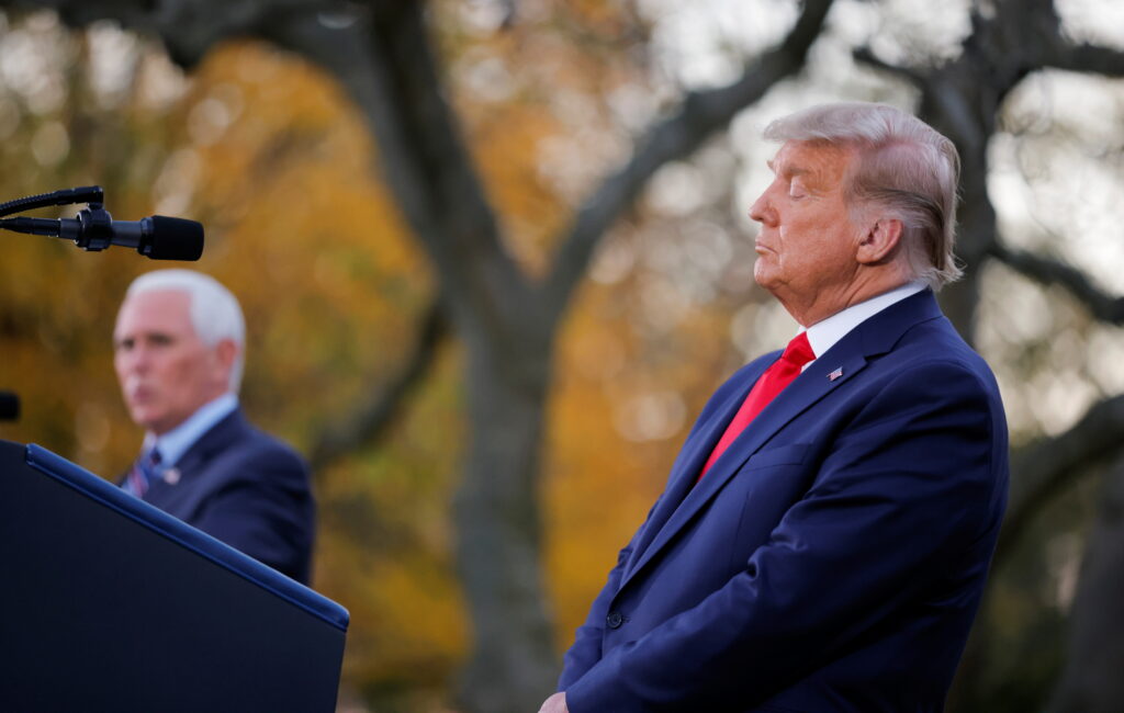 President Donald Trump listens to Vice President Mike Pence speak during an event in the Rose Garden of the White House in Washington, D.C., Nov. 13, 2020.