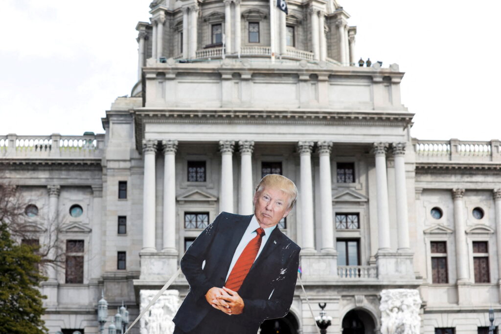 A cardboard cutout depicting President Donald Trump is seen in front of Pennsylvania State Capitol, as supporters of him are expected to protest against the election of President-elect Joe Biden, outside the Pennsylvania State Capitol in Harrisburg, Pennsylvania, on Jan. 17, 2021.