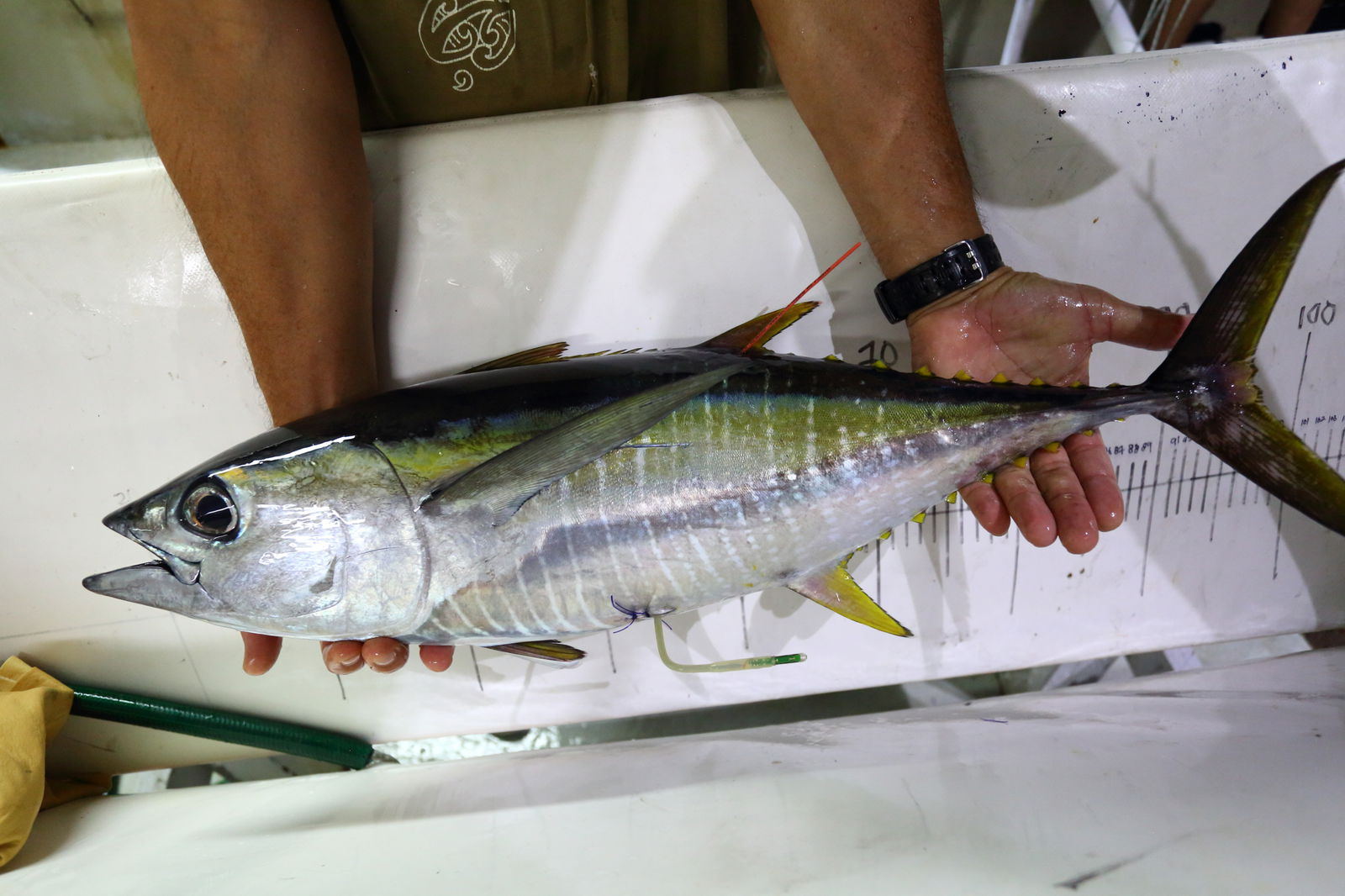 A small yellowfin tuna with an electronic tag protruding from its belly just before it was put back in the ocean by an SPC tuna tagging team. SPC photos