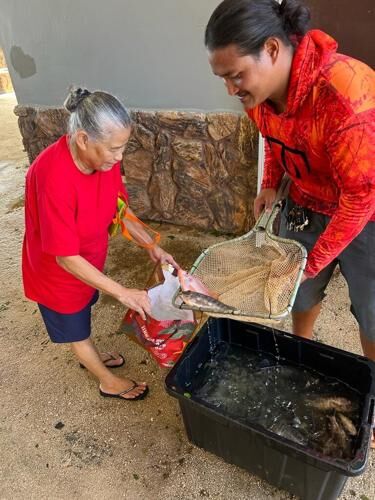 A woman receives tilapia from the Mangilao Mayor’s Office on May 26.