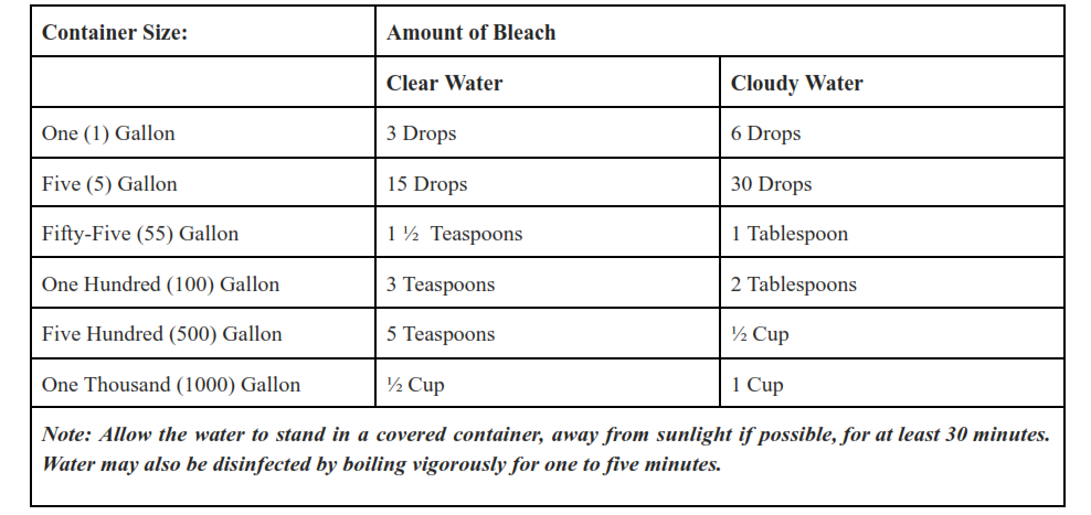 Access to clean water is important. The BECQ Safe Drinking Water Program is informing residents that water may be disinfected by adding a small amount of household bleach (non-scented), such as Clorox, using the following chart: