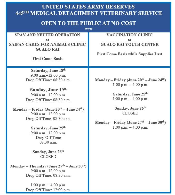 “The 445th Veterinary Services is proud to be a part of this community effort, in partnership with the Office of the Governor, Saipan Cares for Animals, Boonie Babies, and many other citizens and groups and we look forward to getting to know the people and their pets, and enjoying the hospitality that Saipan offers.”