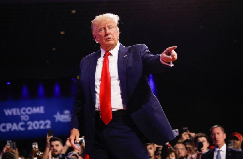 Former President Donald Trump points out to supporters as he leaves the stage after speaking during the Conservative Political Action Conference in Orlando, Florida on Feb. 26, 2022.