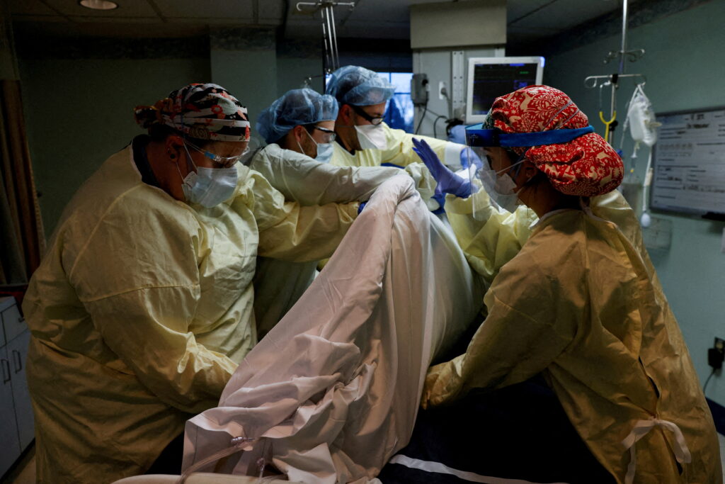 Medical staff treat a coronavirus disease patient in their isolation room at Western Reserve Hospital in Cuyahoga Falls, Ohio, Jan. 4, 2022.